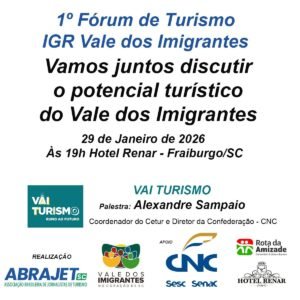 Como parte da programação oficial, a cidade recebe na noite desta quinta-feira, dia 29 de janeiro, às 19h, no Centro de Eventos do Hotel Renar, o I Fórum de Turismo do Vale dos Imigrantes, promovido pela Associação Brasileira de Jornalistas de Turismo de Santa Catarina (ABRAJET-SC) em parceria com a IGR Vale dos Imigrantes.